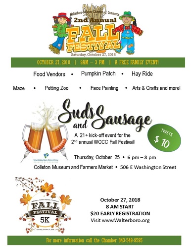 Events start with a 5K at 8:00 and include Arts & Crafts Vendors, Community Vendors, Food & Kid Friendly activities - face painting, pumpkin patch, maze, hayride, & more! For more information contact the Chamber at 843-549-9595.